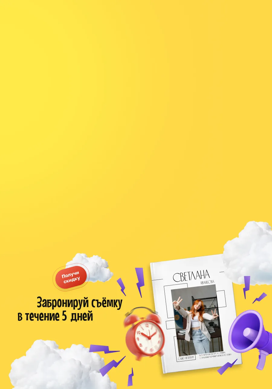 Успейте забронировать фотосъемку в течение 5 дней с момента первого обращения — и получите дополнительную скидку до 10% на выпускной альбом!