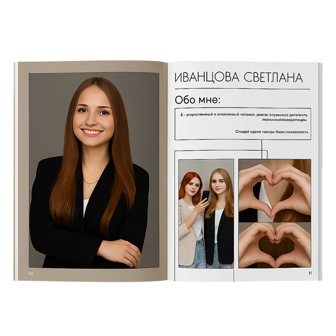 В нашем каталоге можно найти 9 вариантов макета оформления выпускного альбома: от моделей «Премиум» до «Тренда», включая «Персону», «Статус» и другие современные решения. Каждый предложенный на выбор вариант включает в себя портрет выпускника, общие фото класса, виньетки учеников и портрет классного руководителя. Посмотреть примеры работ можно в портфолио на сайте.