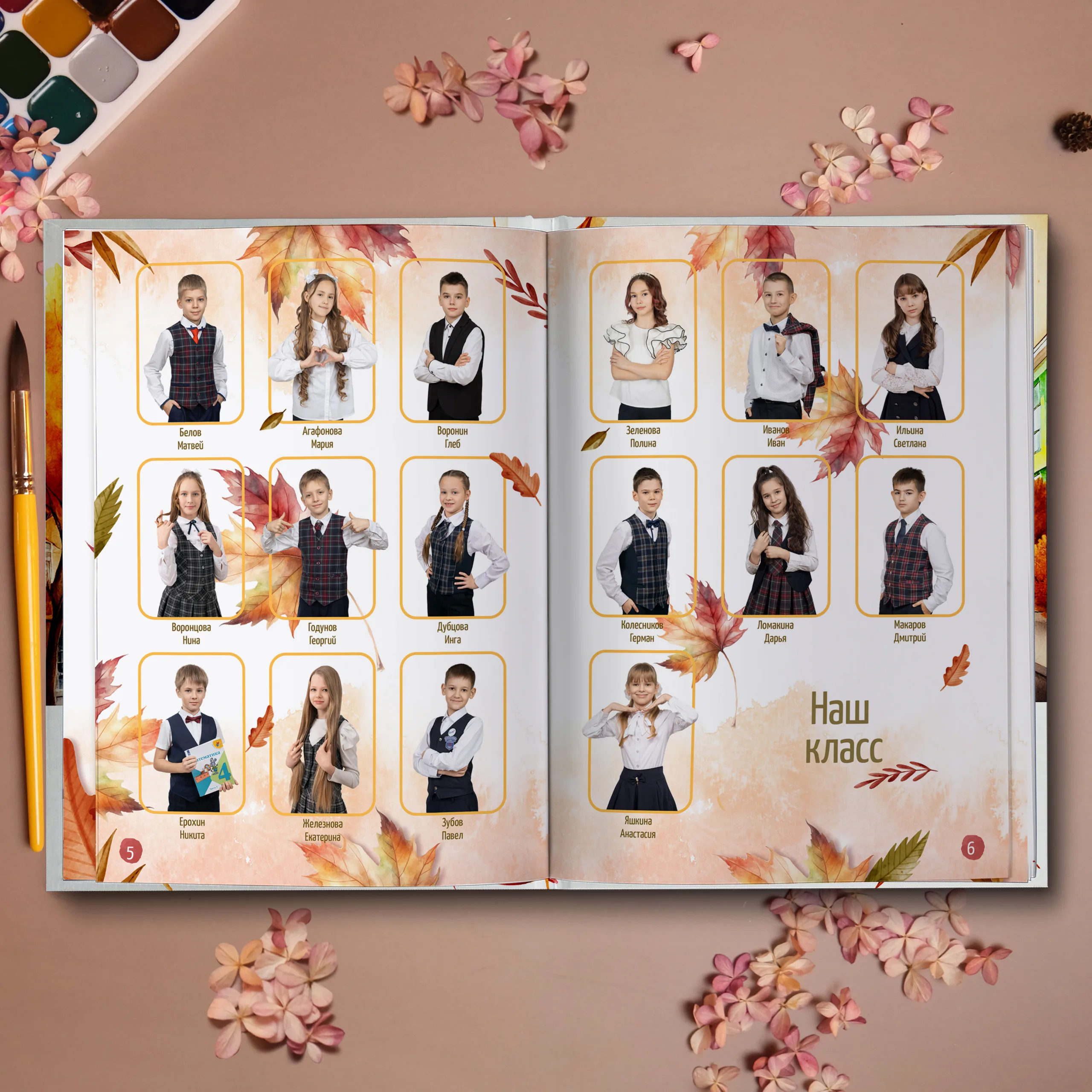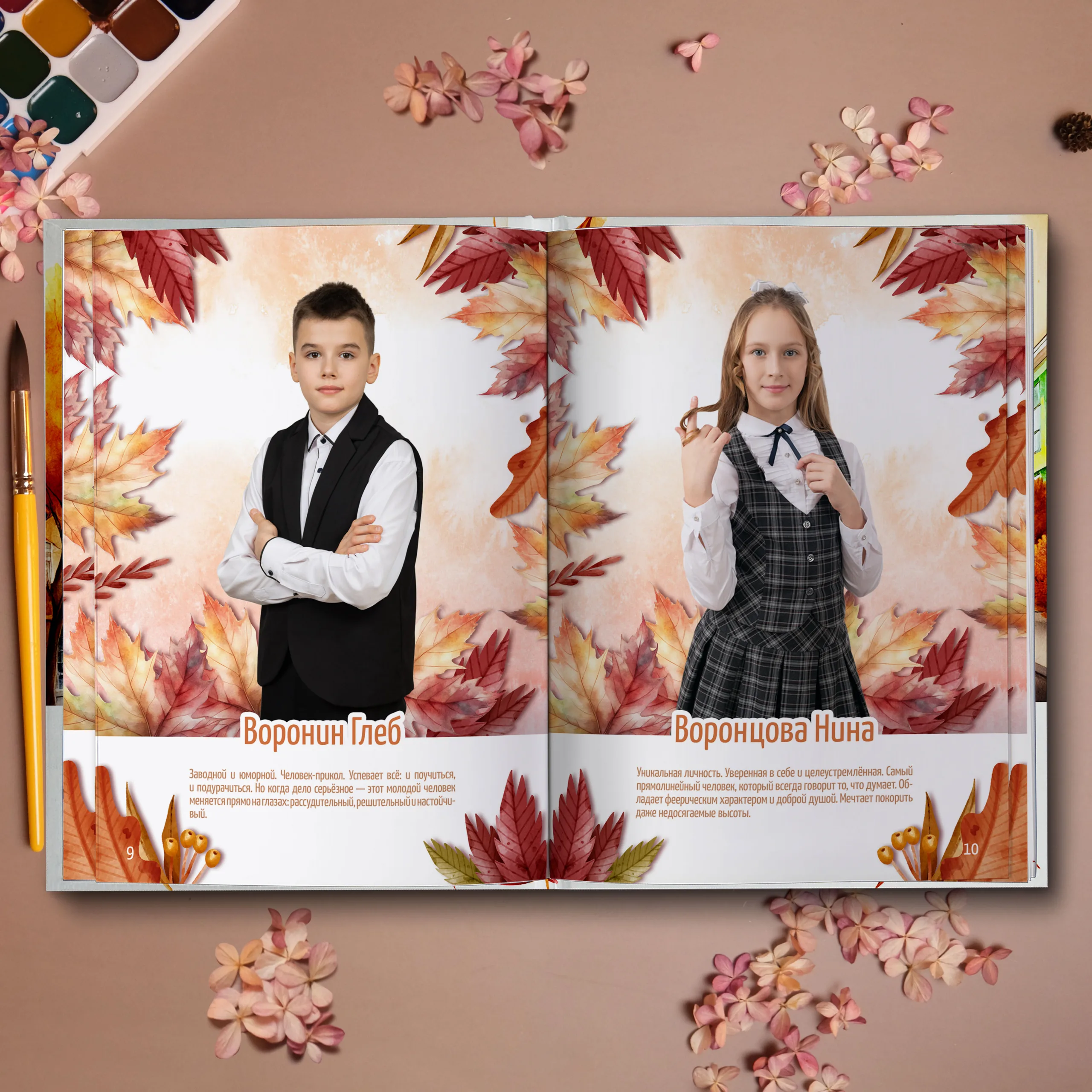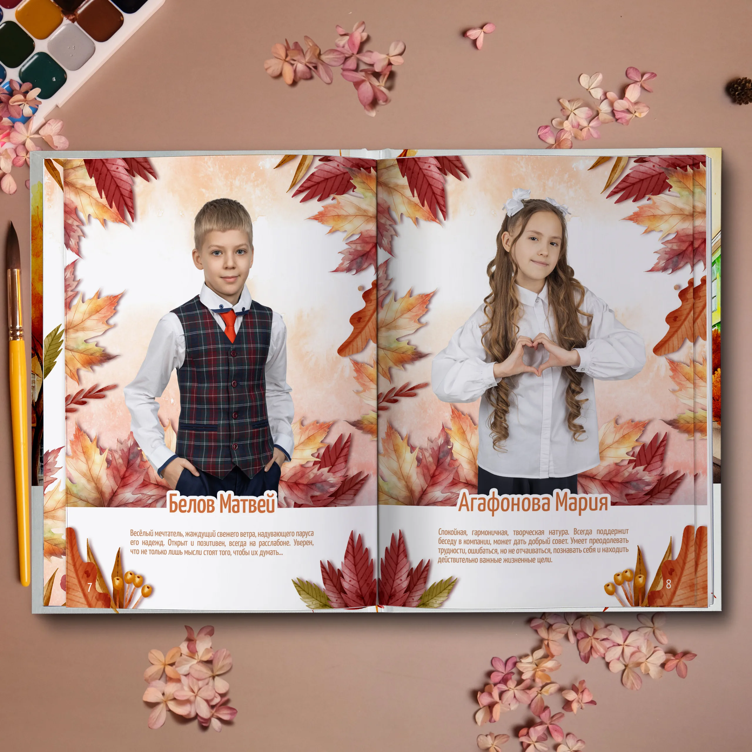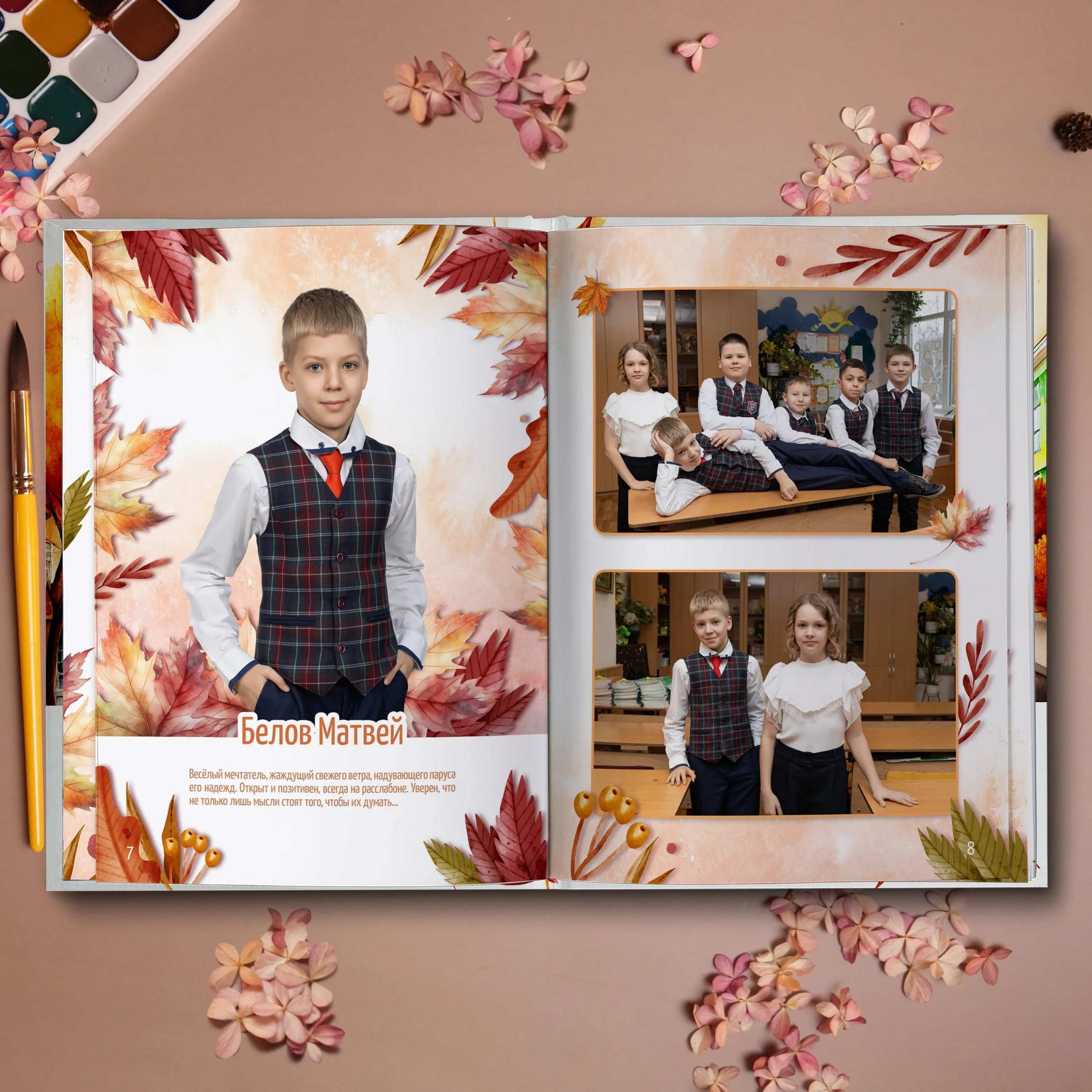 3ий разворот и далее — личные страницы учеников (портретная фотография, информация об ученике и 2 фотографии личного репортажа)