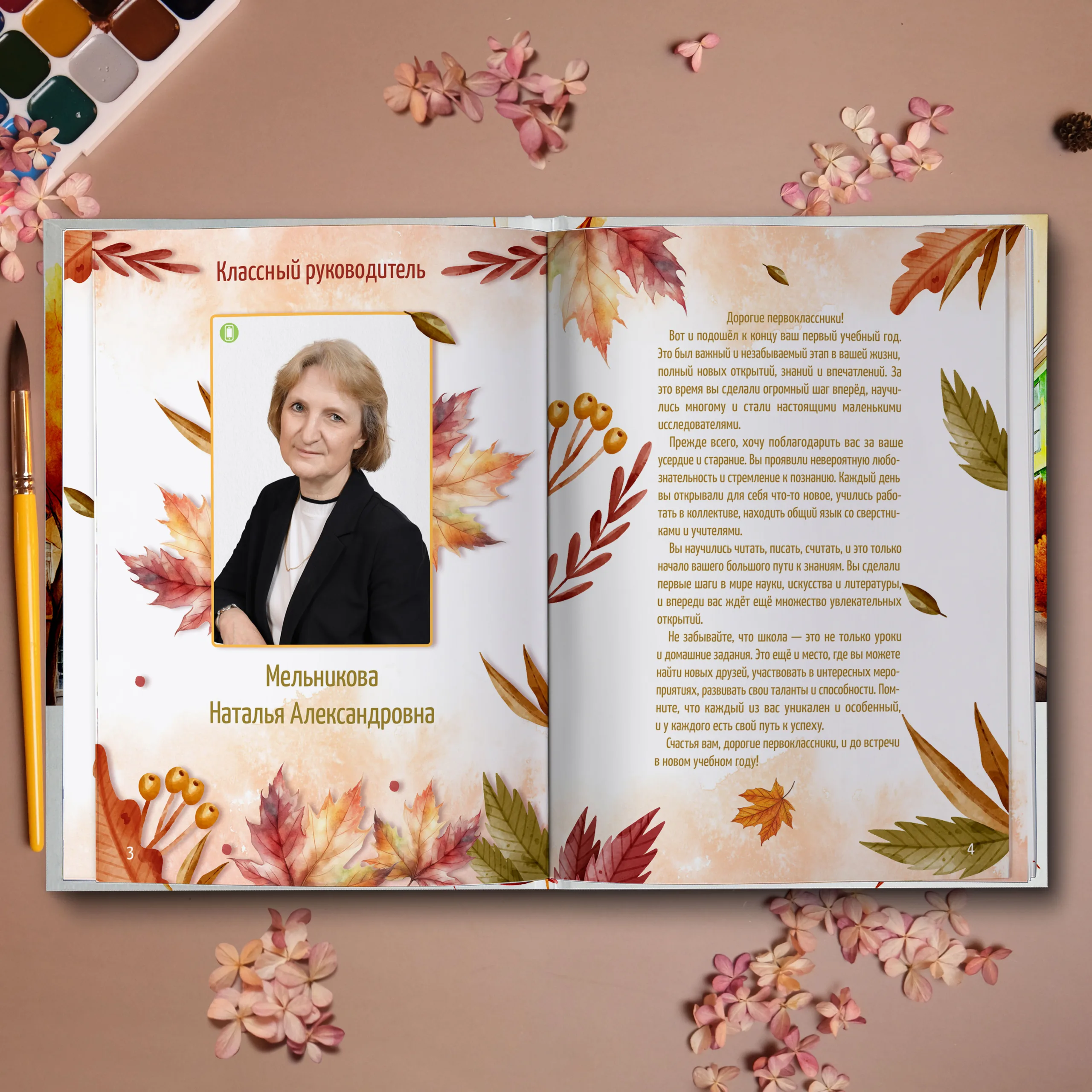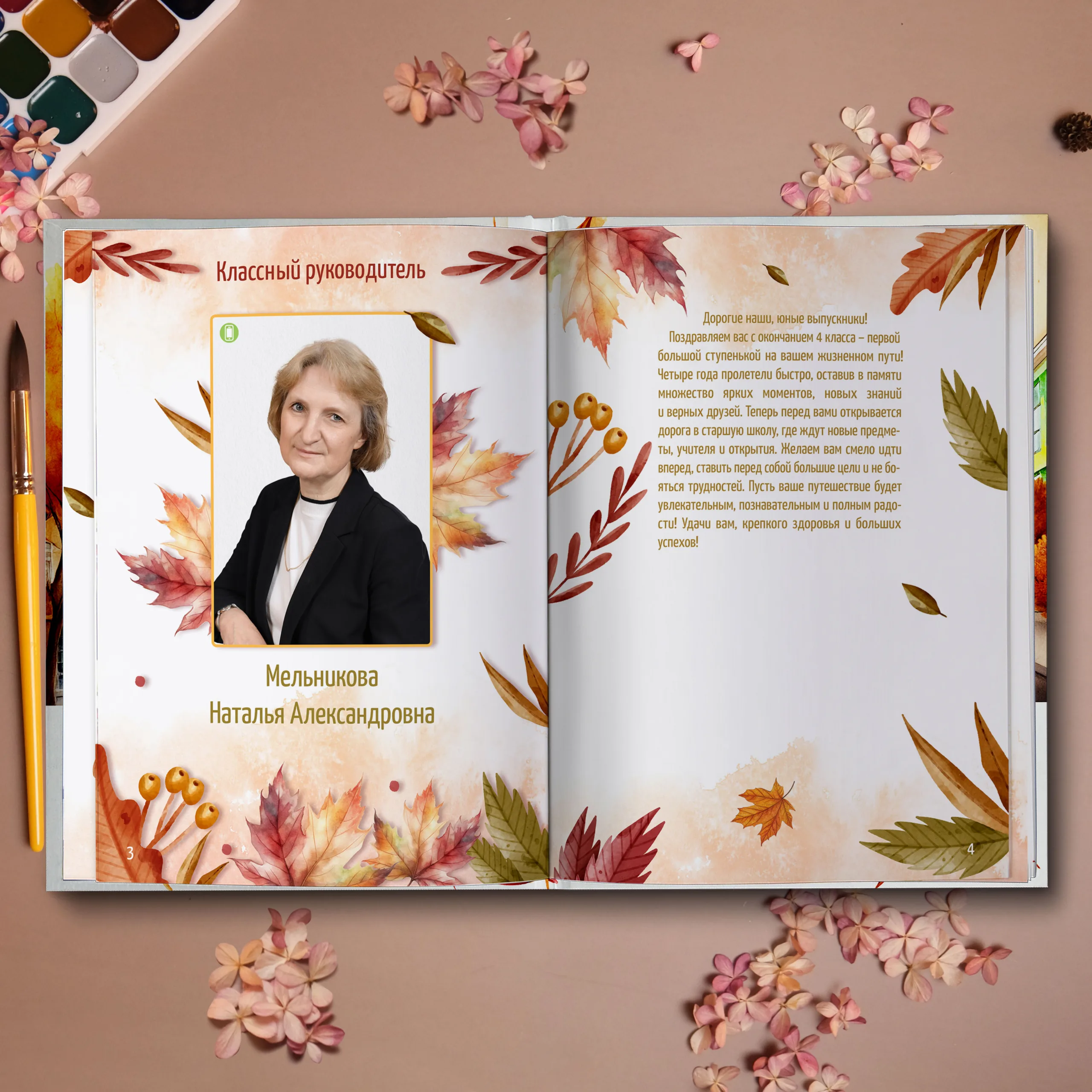 1ый разворот — фотография классного руководителя с напутственным словом